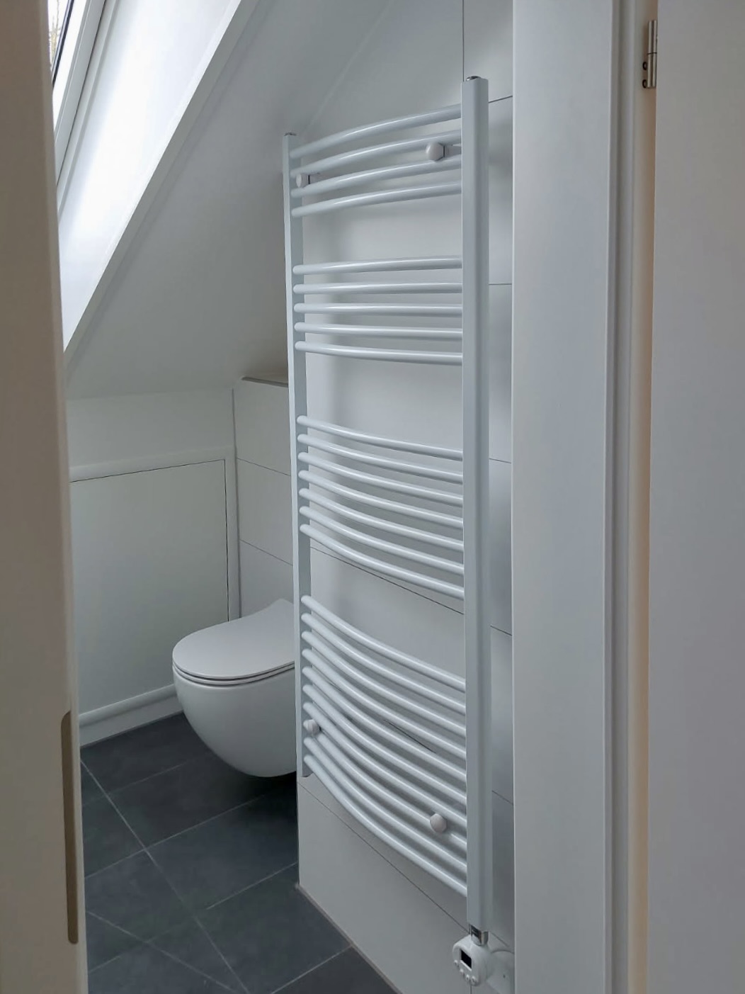Die Heizung der Räume in dieser Wohnung erfolgt elektrisch. Die elektrischen Heizkörper sind hochmodern und mit Thermostaten, Heiz-Timern uvm. ausgestattet. Sie lassen sich effizient und nach dem jeweiligen Bedarf unkompliziert und zeitgesteuert regeln. Bei Lüftung der Wohnung stellen sich die Heizkörper automatisch aus. Die sehr gute Dämmung der Dachflächen wie auch der neuen, dreifach-verglasten Fenster sichert niedrige Heizkosten im Winter sowie angenehmen Temperaturen im Hochsommer.